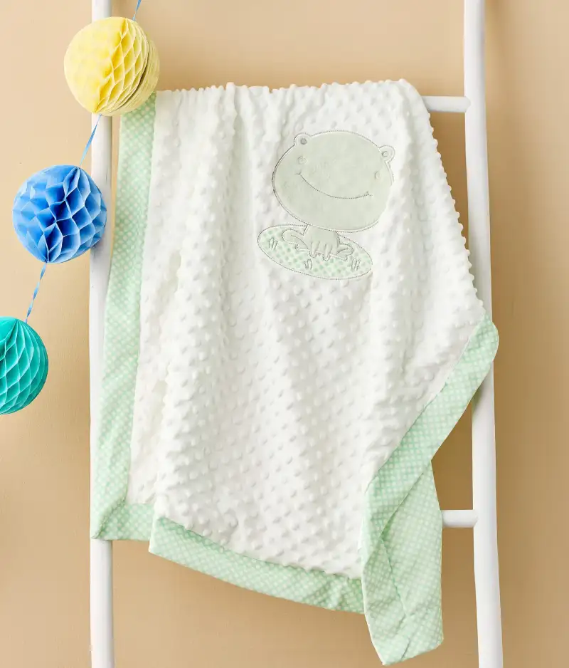 Απαλή βρεφική κουβερτούλα αγκαλιάς διπλής όψης με απλικέ κέντημα βατραχάκι σε πράσινο χρώμα. Σύνθεση: 100% flannel fleece 230gr/m2